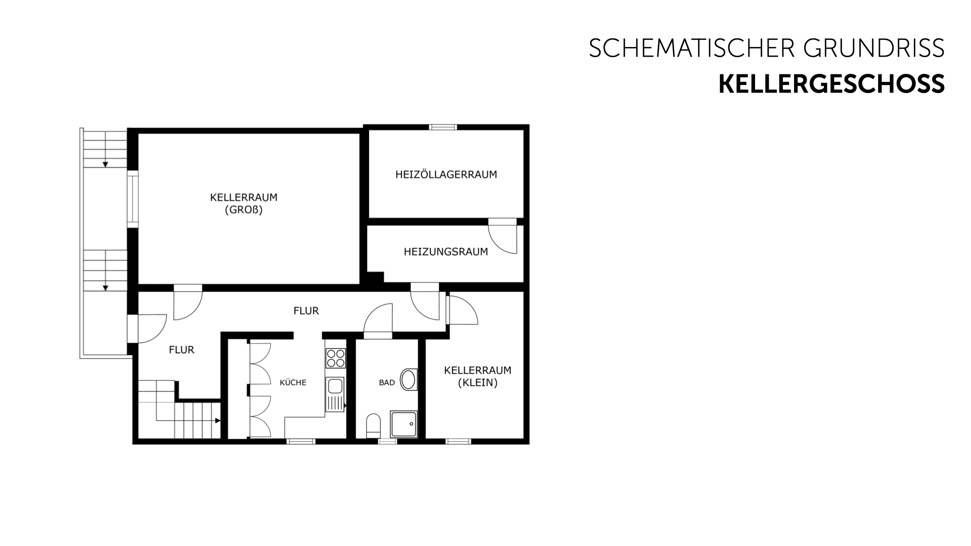 Nutzräume: Großer Kellerraum mit leichter Feuchtigkeitsbildung, kleinerer Kellerraum, Küche und ein Bad mit Dusche
