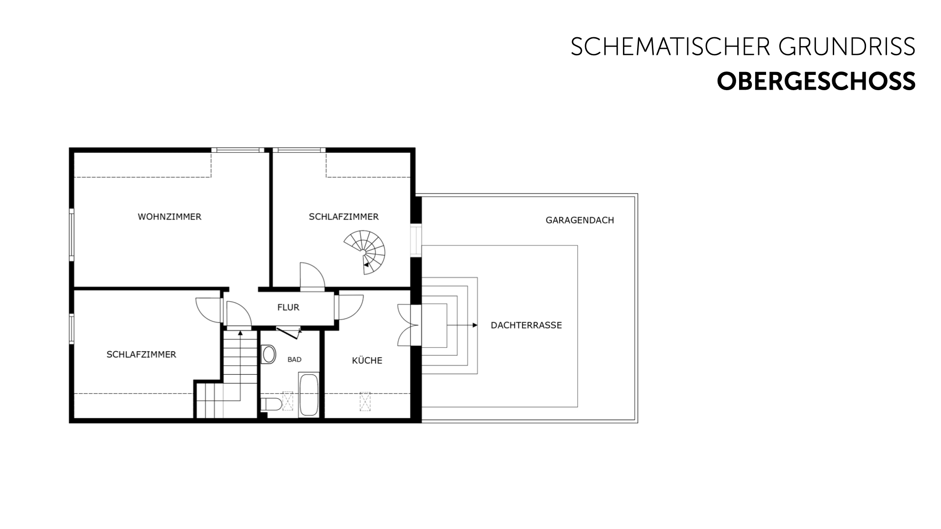 Das Obergeschoss bietet zwei weitere Schlafzimmer, ein großzügiges Wohnzimmer, ein Badezimmer und eine Küche mit Zugang zur Dachterrasse. Die Räume befinden sich überwiegend im Stil der 70er-Jahre und sind renovierungsbedürftig – eine ideale Gelegenheit für eigene Gestaltungsideen oder den modernen Ausbau einer attraktiven Einliegerwohnung.